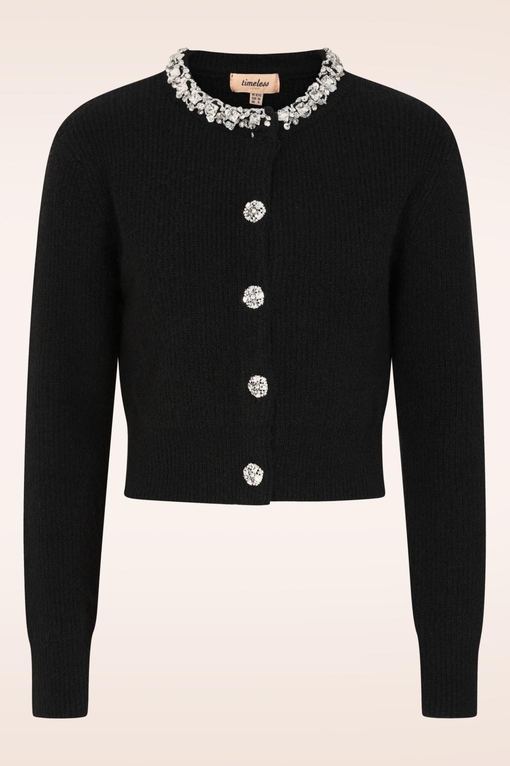 Caspia is een absolute beauty! Ze is uitgevoerd in een fijngebreide en stretchy, zwarte stofmix met wol en afgewerkt met fonkelende strass steentjes en pailletten. * Knopenrij * Verborgen drukknoop bij de hals * Lange mouwen * Lang genoeg om op een normale heupbroek te dragen