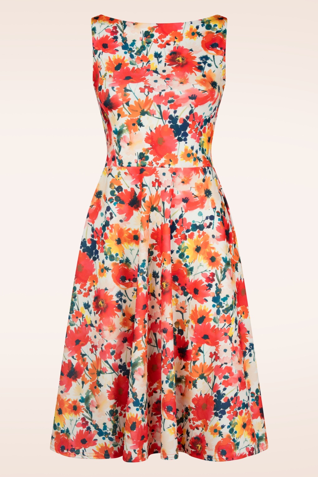 Muurbloempje of ‘wildflower’… in deze vrolijke semi-swing beauty bloei je helemaal op! Uitgevoerd in een een stretchy en crêpe achtig stofje, met een print van klaprozen in oranje, geel en een vleugje blauw.   * Semi-swing stijl * Gevoerde top voor extra comfort * Mouwloos * Blinde rits achterzijde * Valt over de knie bij een lengte van 1,70 m