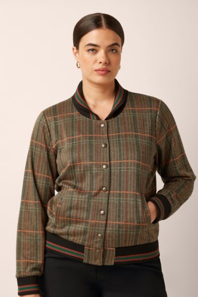 “Checks, charm, and a clean line… that’s the vibe.” Dit korte jack is voorzien van drukknopen en elastische boorden voor die kenmerkende look. Uitgevoerd in een jersey-achtig stofje met een lichte stretch, voorzien van een visgraat en ruitjes patroon.   * Ronde halslijn met omslag kraagje * Lange mouwen * Steekzakjes * Drukknoopjes * Stretchy ribboorden