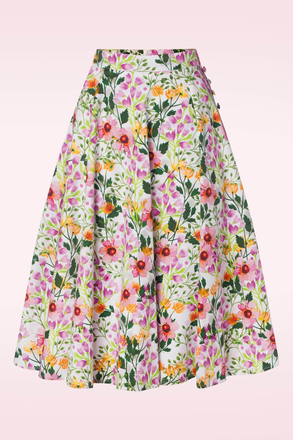 ‘Bloom, flower and flourish’ in deze Daphne swing rok! Ze wordt hoog in de taille gedragen vanwaar ze uitloopt in een zwierige swing rok waardoor er een super vrouwelijk silhouet ontstaat. Uitgevoerd in een stevige maar soepele, katoenmix (stretcht amper) met een prachtige bloemenprint.    * Swing stijl * Zijwaartse steekzakken * Decoratieve knoopjes * Blinde rits achterzijde * Kan gecombineerd worden met een van onze petticoats * Valt bij een lengte van 1,70 m over de knie