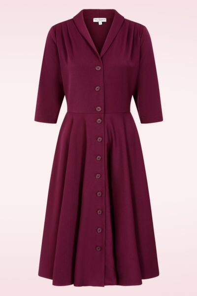 Deze D’Laine jurk is een vintage droom die uitkomt! Supervrouwelijk en elegant dankzij het kraagje, de reeks knopen en 3/4-mouwen. Vanaf de taille loopt ze uit in een zwierige, volle swingrok die een prachtig vrouwelijk silhouet creëert. Uitgevoerd in een stevige maar soepel vallende stofmix met een vleugje viscose, in een rijke bordeauxrode kleur met een fijne stretch voor heerlijk draagcomfort. Dromen zijn niet altijd bedrog! 😉   * Full swing model * V-halslijn * Afgeronde kraag * Reeks knopen * 3/4 mouwen * Kan gecombineerd worden met een van onze petticoats * Valt bij een lengte van 1,70 m over de knie