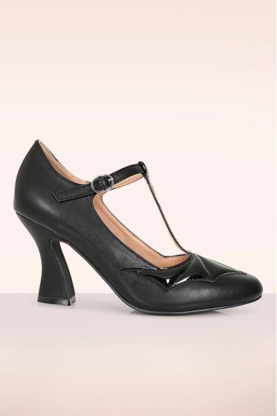 “Wickedly stylish, Elvira makes every step a little more haunting.” Halloween inspired pumps met een T-strap bandje, een lak detail en een asymmetrische hoge hak uitgevoerd in hoogwaardig zwart kunstleder.    * T-strap pumps * Verstelbaar bandje * Asymmetrische hak  * Comfy binnenzool * Anti-slip zool