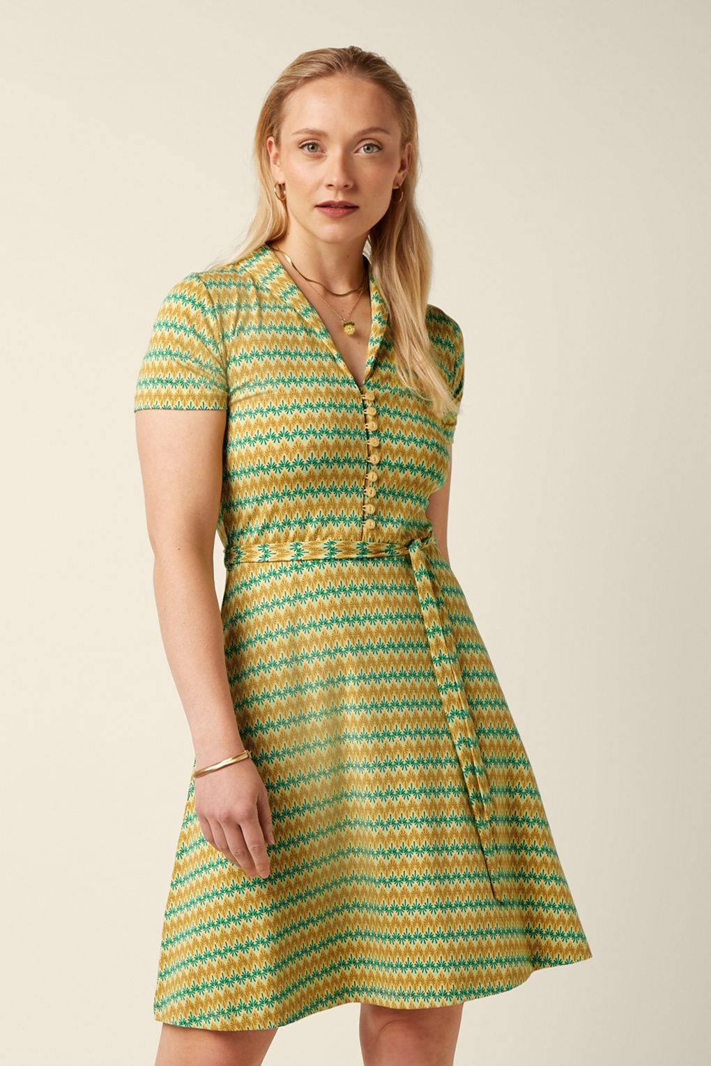 Deze Emmy jurk is alles wat je nodig hebt dit seizoen! Ze is speels maar toch heel vrouwelijk door haar aansluitende top, flatterende korte mouwtjes en reeks knoopjes. De taille wordt mooi geaccentueerd door het striklint vanwaar ze uitloopt in een flowy rok. Uitgevoerd in een heerlijk soepele en stretchy bio katoenmix met een retro print in geel en groentinten. * V-halslijn met omslagkraagje * Korte mouwen * Knopenrij * Afneembaar striklint voor een extra ‘snatched’ taille * Valt bij een lengte van 1,70 m boven de knie