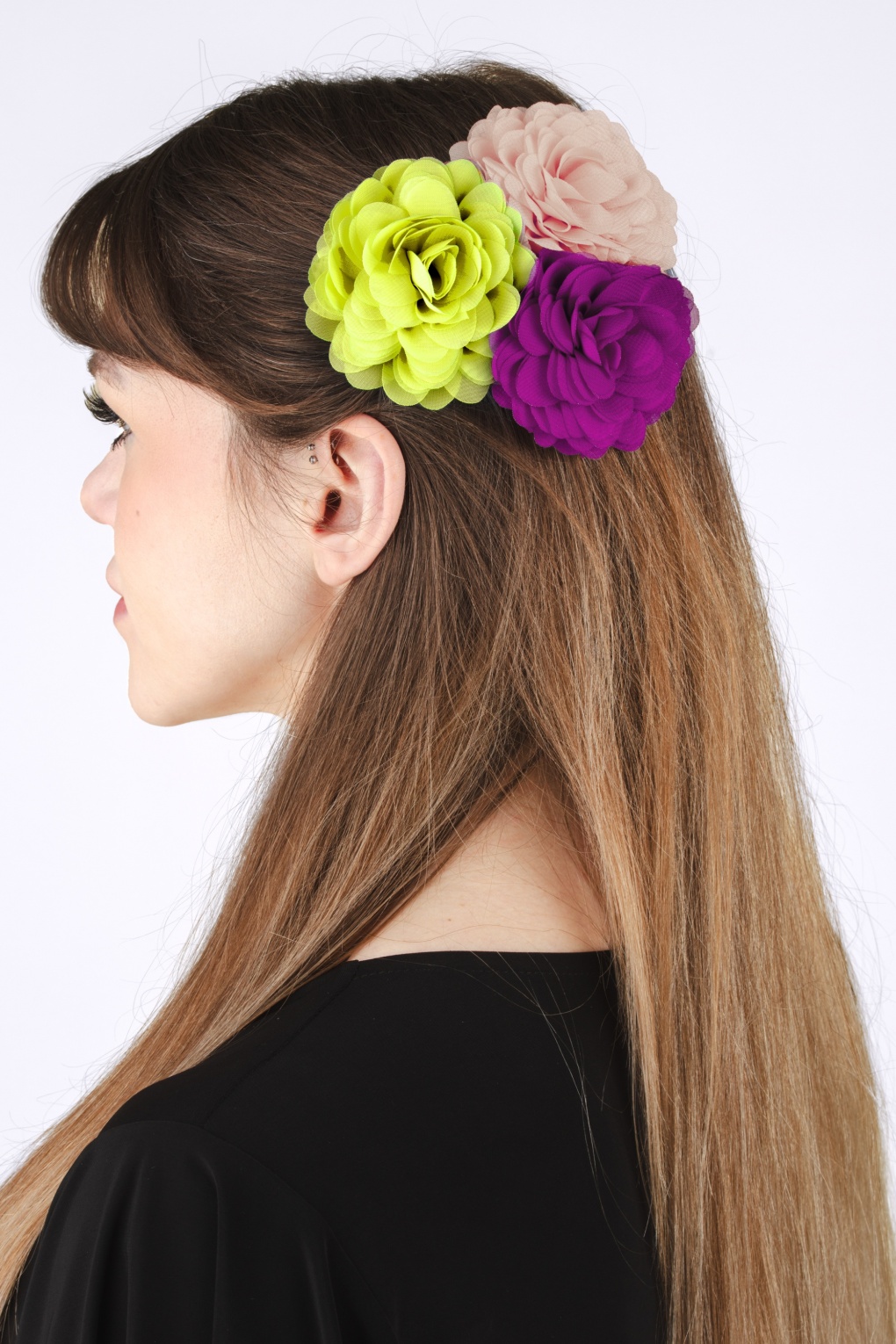 Haarbloemen set in yellow olive, violet pink en powder pink