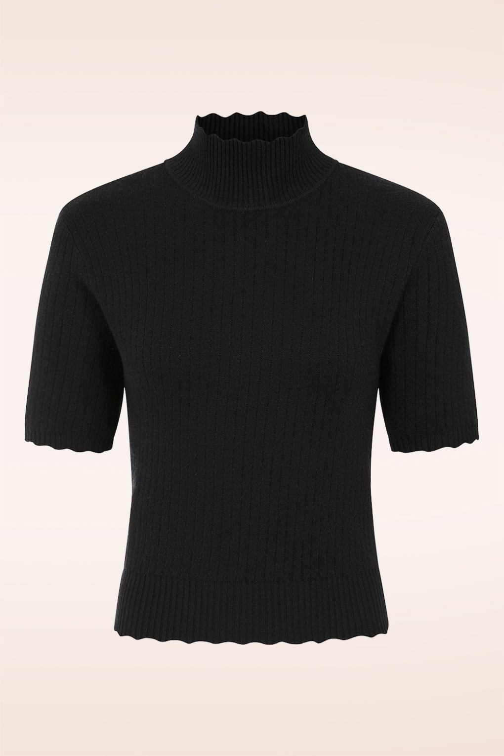 “Cozy meets chic!” Deze gebreide top heeft korte mouwen, een opstaand kraagje en een flatterende ribstructuur. De geschulpte ribboorden geven haar een extra speelse en vrouwelijke touch. Uitgevoerd in een soepele, stretchy zwarte stofmix met een vleugje viscose. * Opstaand kraagje * Afgeronde ribboorden  * Lang genoeg om op een normale heupbroek te dragen