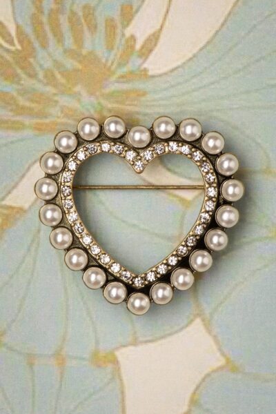 Deze 50s Heart Pearl Brooch in Gold gaat je hart veroveren! Uitgevoerd in ‘antiek’ goudkleurig metaal, verfraaid met faux pareltjes en fonkelende strass steentjes. Ben je je hart al verloren aan deze beauty van een broche? * Goudkleurig metaal * Faux pareltjes * Strass * Pinsluiting * Handgemaakt * Nikkelvrij