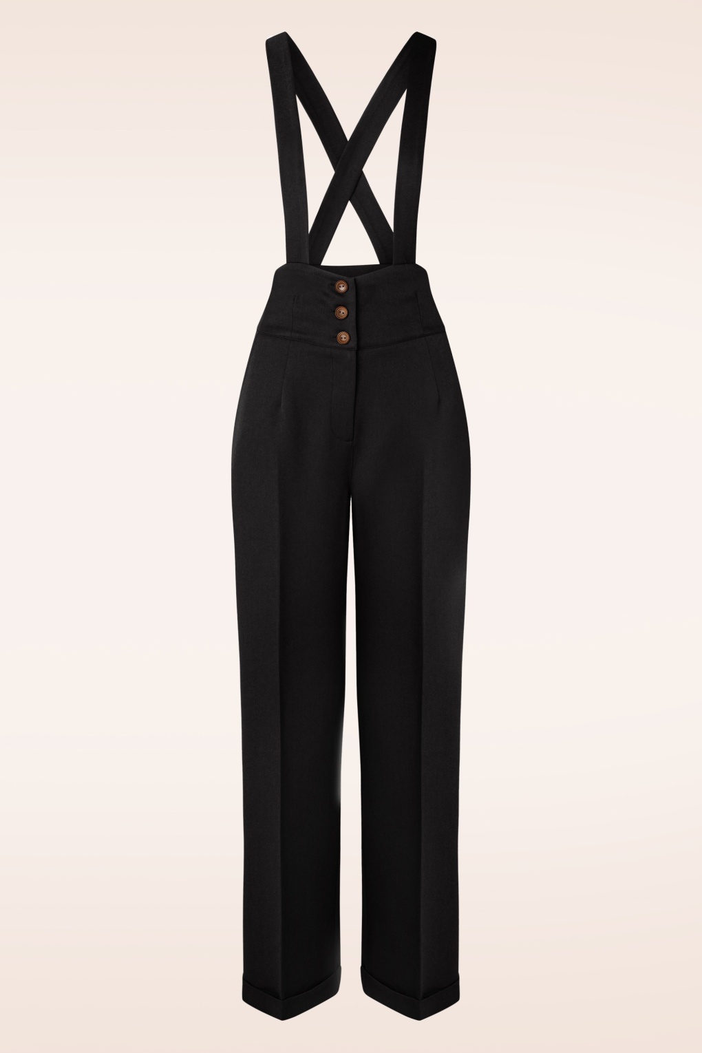 Deze 40s Her Favourite Trousers in Black wordt dit najaar ook jouw favoriet! Op het eerste oog lijkt ze een klassieke pantalon met knoopsluiting en steekzakken, maar het leuke aan deze pantalon is dat ze geleverd wordt met afneembare ‘bretels’ waardoor ze een compleet andere look krijgt en je eindeloos kunt variëren. Ze maakt met haar vrouwelijke hoge taille, wijdere pijp, persvouw en chique omslagjes een dikke knipoog naar de jaren 40. Uitgevoerd in een stevige maar soepel vallende, zwarte stof (stretcht amper) die heerlijk draagt. Terecht een favorietje… toch? 😉   * Hoge taille * Knoop- en ritssluiting voorzijde * Wijde pijpen met omslag * Zijwaartse steekzakken * Afneembare en verstelbare ‘bretels’ * ‘Faux’ paspelzakjes aan de achterzijde