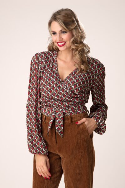 ”Graphic by design, iconic by nature; this wrap blouse is wearable art!” Jennifer is door onze eigen in-house designers ontworpen en exclusief bij Topvintage verkrijgbaar! Deze bohemian beauty heeft vaste strikbanden, lange elegante pofmouwen met elastiek en is afgewerkt met sierlijke rushes langs de biezen. Ze is uitgevoerd in een soepele en luchtige, faded zwarte viscose (stretcht niet!) met een unieke grafische print in rood, bruin en wit.    * Wikkeltop * Korter model * Gevoerd * V-halslijn  * Ruches * Lange pofmouwen met elastiek * Vaste strikbanden * Exclusief bij Topvintage verkrijgbaar