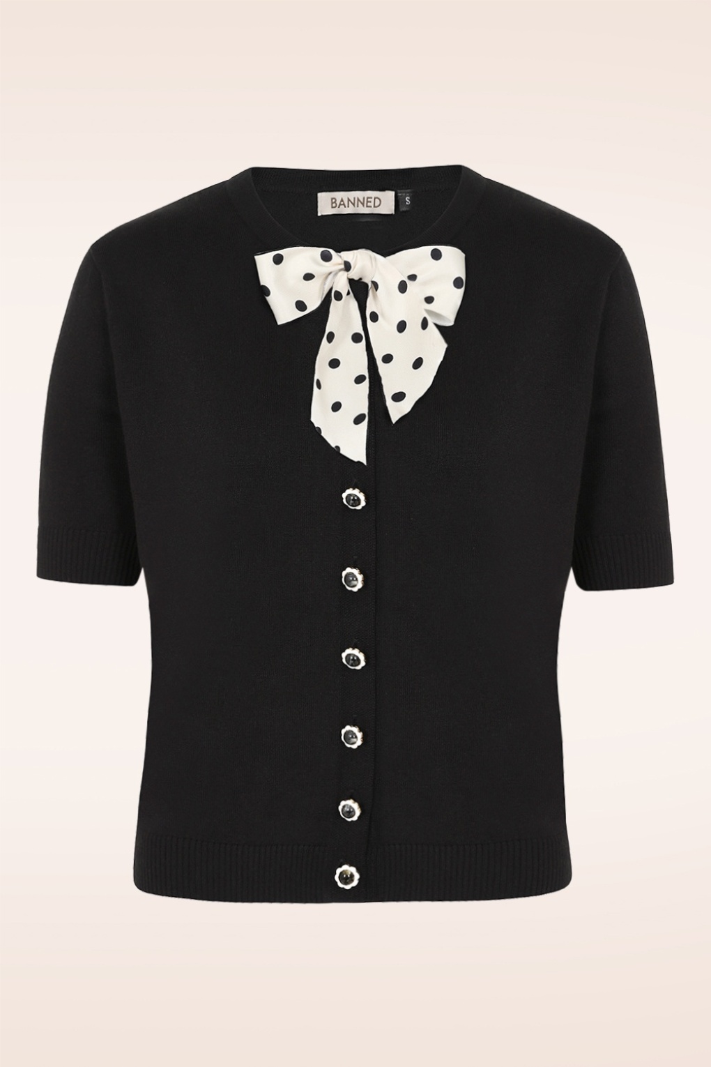 Altijd al op zoek naar HET ultieme vestje.. Lady Luck is on your side!! Ze is super veelzijdig, zacht en voorzien van korte mouwtjes, schattige bloemvormige knoopjes en een afneembaar striklint met polka dots, voor die extra cute touch! Uitgevoerd in een fijngebreide en stretchy viscosemix in zwart, waardoor ze heerlijk comfortabel draagt.    * Ronde halslijn * Afneembaar striklint * Korte mouwen * Knopenrij * Stretchy ribboorden * Lang genoeg om op een normale heupbroek te dragen