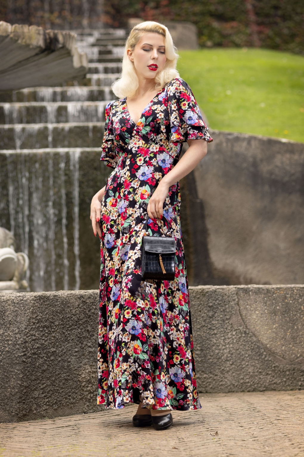 ”Happiness blooms from within… unless you’re wearing a dress like Laura!” Niet alleen is ze exclusief verkrijgbaar bij Topvintage, ze is ook met liefde ontworpen door onze eigen in-house designers. Laura is uitgevoerd in een soepel zwarte viscose, (stretcht niet!) met de look and feel van satijn, die heerlijk comfortabel draagt en voorzien is van een prachtige bloemenprint.    * Maxi  * V-halslijn * Plooitjes bij de buste * Korte vlindermouwtjes met ruches * Gevoerde top * Blinde rits aan de achterkant * Valt bij een lengte van 1,70 m tot op de enkel * Exclusief bij Topvintage verkrijgbaar