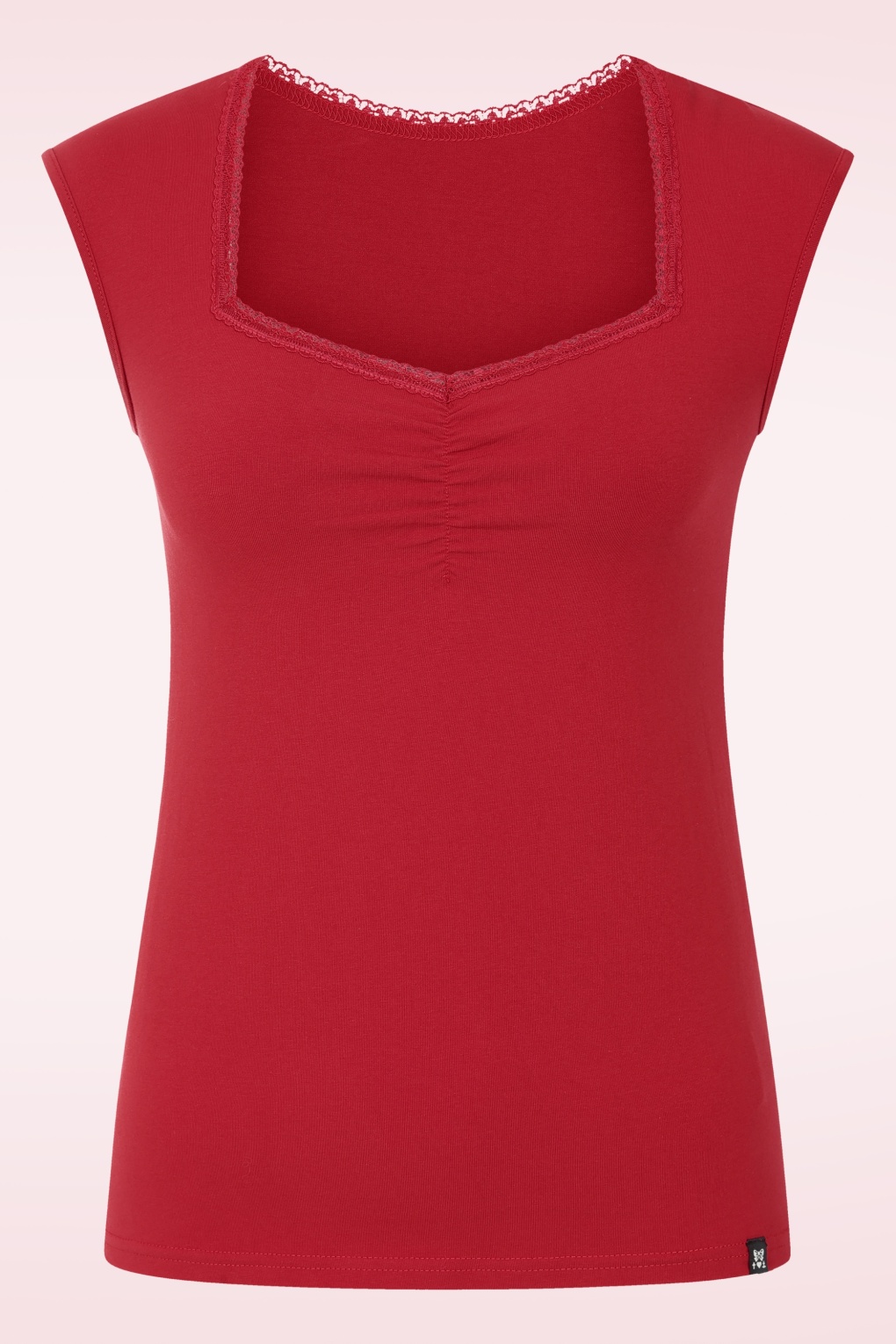 Zie jij alle fantastische combi’s met deze top al voor je?! De diamantvormige halslijn is afgewerkt met een kanten biesje en zorgt ervoor dat je een prachtig decolleté laat zien. Uitgevoerd in een stretchy, kersenrode bio katoenmix voor een mooie aansluitende pasvorm. Waar je haar ook mee combineert, ze zal alle outfits omtoveren in een prachtplaatje!   * Kanten biesje * Lang genoeg om op een normale heupbroek te dragen