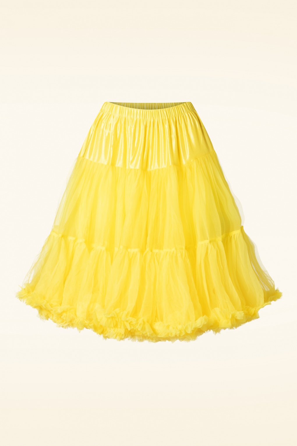 ”Behind every great twirl is a trusty petticoat!” De 2 lagen stof zorgen voor extra volume, bewegen gracieus met je mee en zijn afgezet met speelse ruches aan de onderzijde. De bovenkant is uitgevoerd in citroengele tule en de onderrok is gemaakt van een glanzende sateen. Afgewerkt met een elastieken band. Deze petticoat geeft iedere swing jurk net dat beetje extra! * Geschikt voor al onze swing dresses en rokken * Elastische tailleband * Valt over de knie bij een lengte 1,70 m