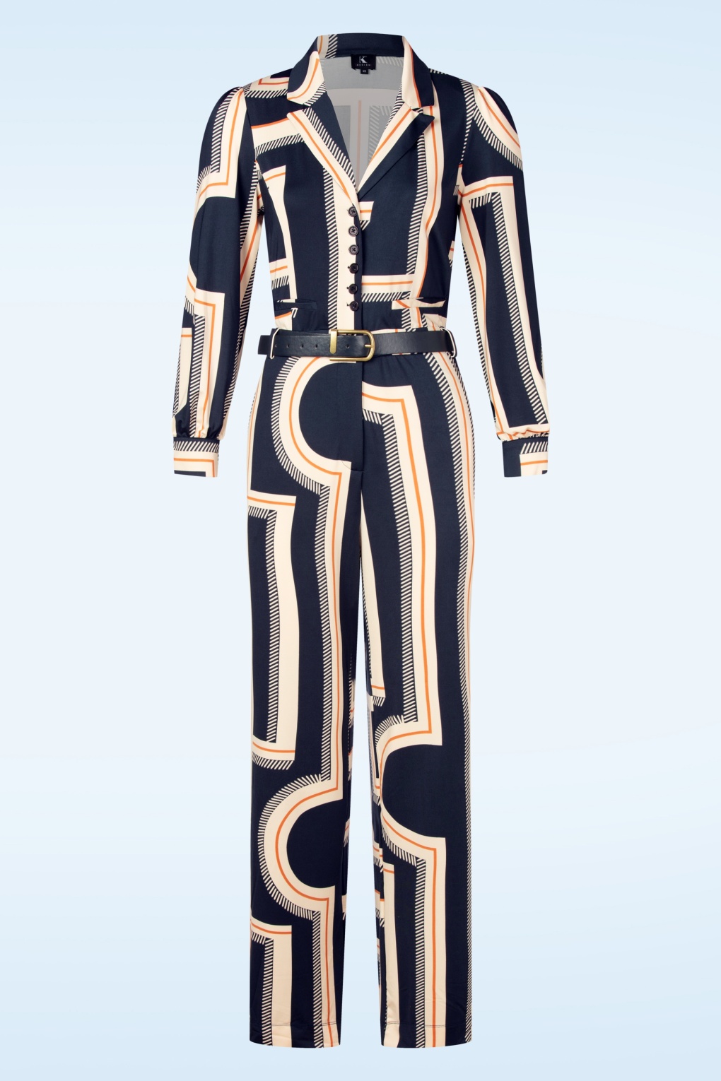 “One-and-done chic… this graphic navy jumpsuit makes bold moves feel effortless.” Deze jumpsuit met wijde pijpen is uitgevoerd in een soepel en stretchy, slinky stofje in navy met een grafische print in crème en bruin, voorzien van een StayFresh coating.     * Jumpsuit * Puntig kraagje * Knopenreeks top * Knoop- en ritssluiting voorzijde broek gedeelte * Afneembare riem, voor een extra ‘snatched’ taille * It has pockets! * Decoratieve paspelzakken achterzijde * Lange, wijde pijpen * StayFresh coating!
