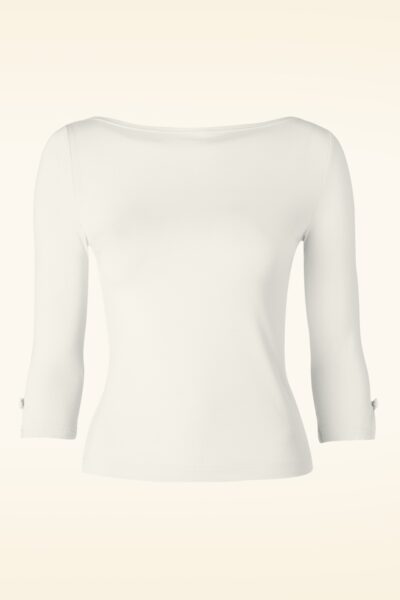 Elegant en schattig deze 50s Modern Love Top! Eenvoudig maar toch speciaal door de lieflijke details! De top heeft een mooie boothals en mouwtjes met splitjes die afgezet zijn met kleine strikjes, só cute! Uitgevoerd in een heerlijke soepele, stretchy ivoorwitte viscose mix die zijn perfecte pasvorm zal blijven behouden, zelfs na een aantal wasbeurten. Een veelzijdige classy top die niet mag ontbreken in de kast van een echte vintage lady 😉   * 3/4 mouwtjes * Vaste strikjes