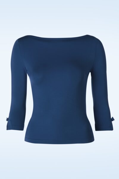 Elegant en schattig deze 50s Modern Love Top in Navy! Eenvoudig maar toch speciaal door de lieflijke details! De top heeft een mooie boothals en mouwtjes met splitjes die afgezet zijn met kleine strikjes, só cute! Uitgevoerd in een heerlijke soepele, stretchy donkerblauwe viscosemix die zijn perfecte pasvorm zal blijven behouden, zelfs na een aantal wasbeurten. Een veelzijdige classy top die niet mag ontbreken in de kast van een echte vintage lady 😉   * 3/4 mouwtjes * Vaste strikjes