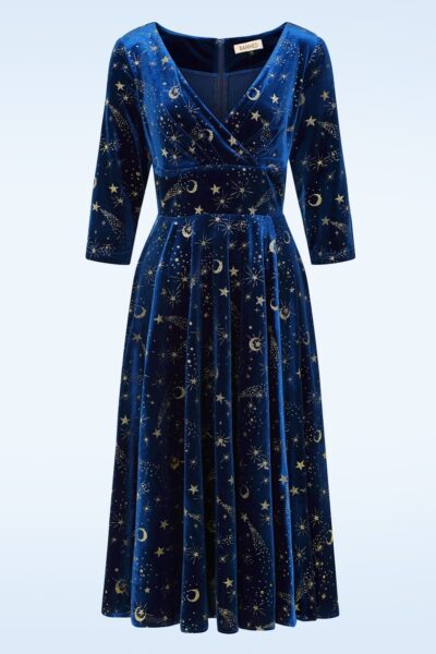 “Where sparkle meets sophistication!” Voel de magie van de nacht in de betoverende Moonlit Stardust swing jurk. Met een elegante V-halslijn, flatterende 3/4 mouwen en een zwierige rok die je silhouet prachtig laat uitkomen. Uitgevoerd in middernachtblauw met een glanzende, stretchy stof die aanvoelt als fluweel, en bezaaid met glinsterende goudkleurige sterren en maantjes voor een echte avondlook. * Swing jurk * V-hals met vaste overslag  * Gevoerde top * 3/4 mouwen * Rits- en haaksluiting achterzijde * Reikt bij een lengte van 1,70 m over de knie
