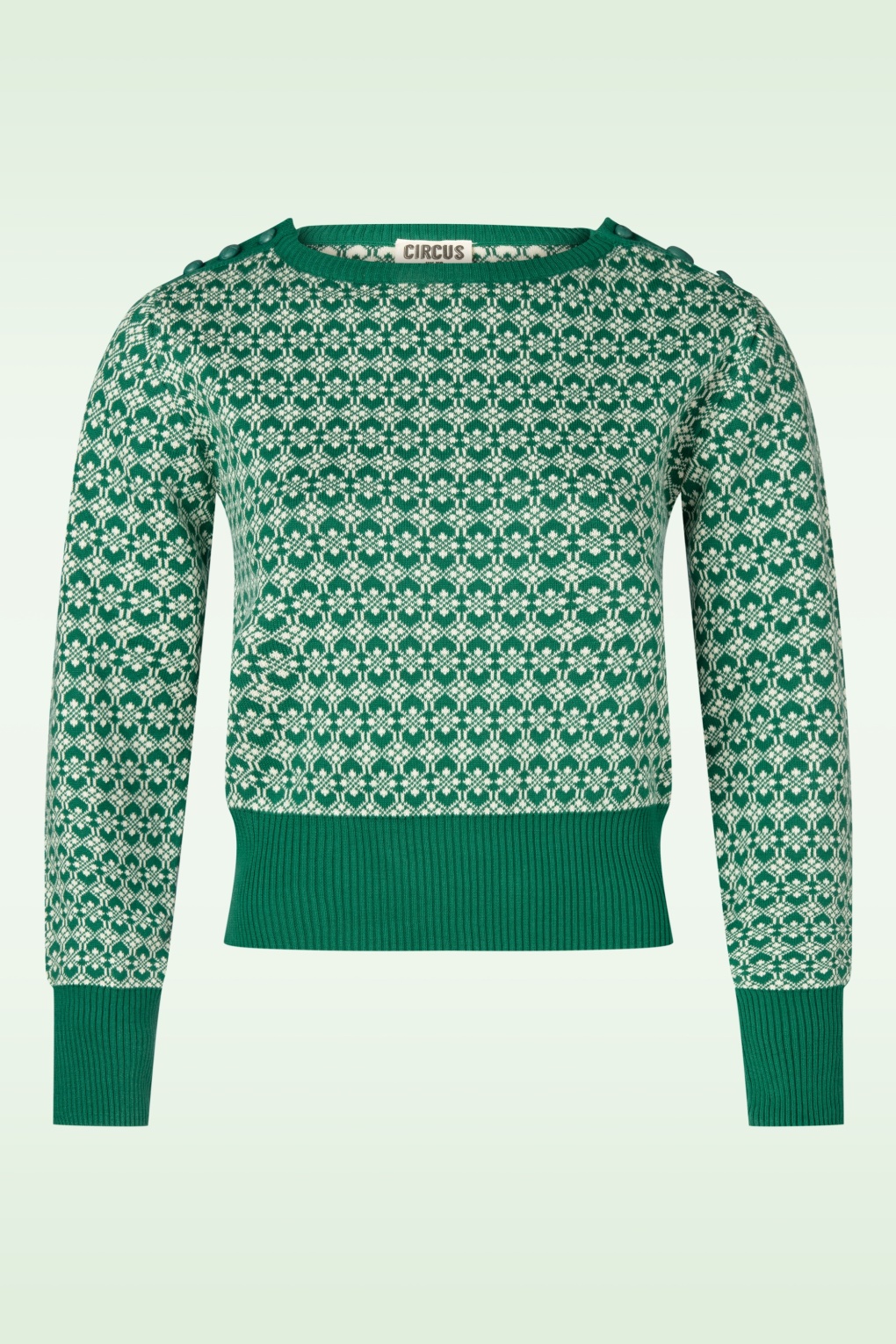 ”Retro vibes only!” Deze groovy sweater is niet alleen mooi om te zien, maar houdt je ook nog eens heerlijk warm tijdens de koudere dagen! Ze is uitgevoerd in een fijngebreide, soepele en stretchy, organische katoen voorzien van een retro patroon in bosgroen en gebroken wit. * Functionele knopen op de schouders * Stretchy ribboorden * Lang genoeg om op een normale heupbroek te dragen