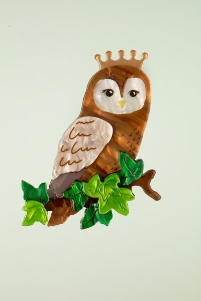 ”Woodland royalty, the owl whispers wise tales under the moon’s glow. ”In every leaf,” he hoots, ”lies a story waiting to be told.” * Online in Nederland, Duitsland en België exclusief bij Topvintage verkrijgbaar * Handgemaakt, handbeschilderd en uitgevoerd in verschillende lagen hars * Zilverkleurige pinsluiting * Erstwilder x Fleur Harris ‘Woodland Creatures’ collectie