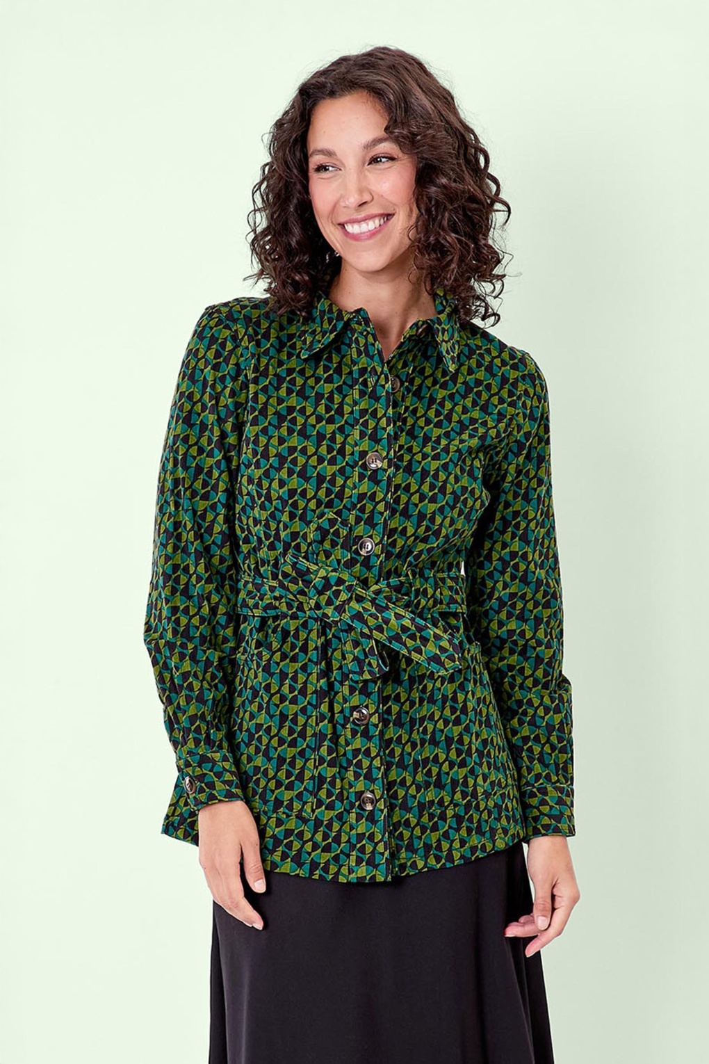 “A statement in motion… ribbed texture meets bold retro greens and blues for a look that’s effortlessly iconic!” Deze jacket stijl blouse is uitgevoerd in een stevige maar stretchy, subtiele ribfluwelen katoenmix voorzien van een grafische retro print in groen- en blauw tinten. * Puntig kraagje * Lange, licht poffende mouwen met manchet * Reeks knopen voorzijde * Met zakken! * Afneembare strikband voor een extra ‘snatched’ taille * Lang genoeg om op een normale heupbroek te dragen
