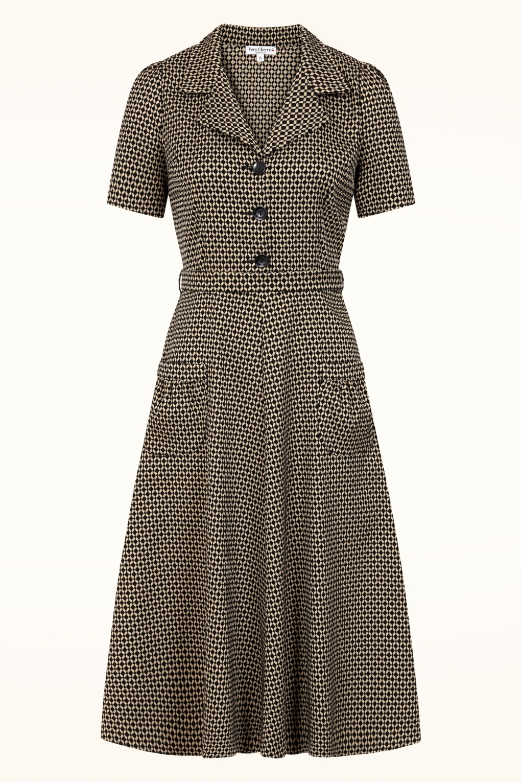 “Pattern play, all day!” Deze comfortabele en elegante semi-swing jurk heeft een V-halslijn met een speels reverskraagje, korte pofmouwen en een reeks grote knopen. Het striklint accentueert je taille voor een supervrouwelijk silhouet, en de opgenaaide zakjes aan de voorzijde geven haar een speelse touch. Ze is uitgevoerd in een iets dikkere, maar soepel vallende stofmix met een vleugje katoen en een fijne stretch, voor optimaal draagcomfort. * Semi-swing model * V-halslijn * Revers kraagje * Korte pofmouwen * Reeks knopen voorzijde * Afneembaar striklint, voor een extra ‘snatched’ taille * Zakjes voorzijde * Blinde rits aan de zijkant * Valt bij een lengte van 1,70 m halverwege de kuit