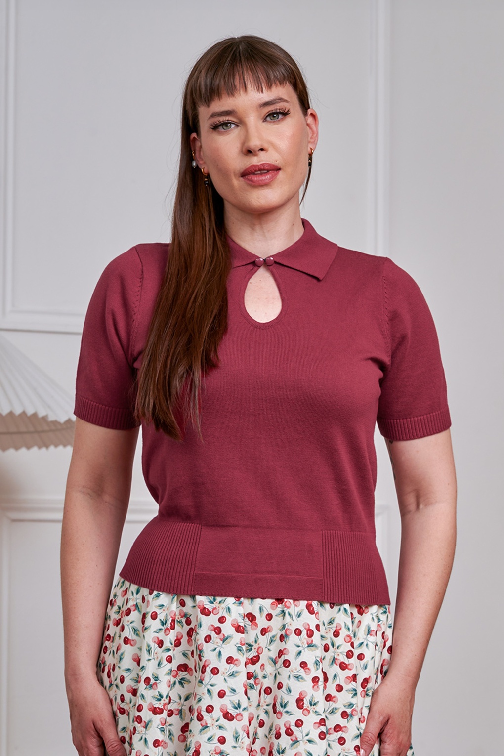 ”Made for quiet charm!” Dit fijngebreide topje heeft een kraagje met keyhole detail, korte mouwtjes en is uitgevoerd in een zachte en stretchy, 100% katoen in bordeauxrood die heerlijk draagt.    * Kraagje  * Keyhole detail met haaksluiting en sierknoopjes * Korte mouwtjes * Stretchy ribboorden * Lang genoeg om op een mid-waist broek of rok te dragen