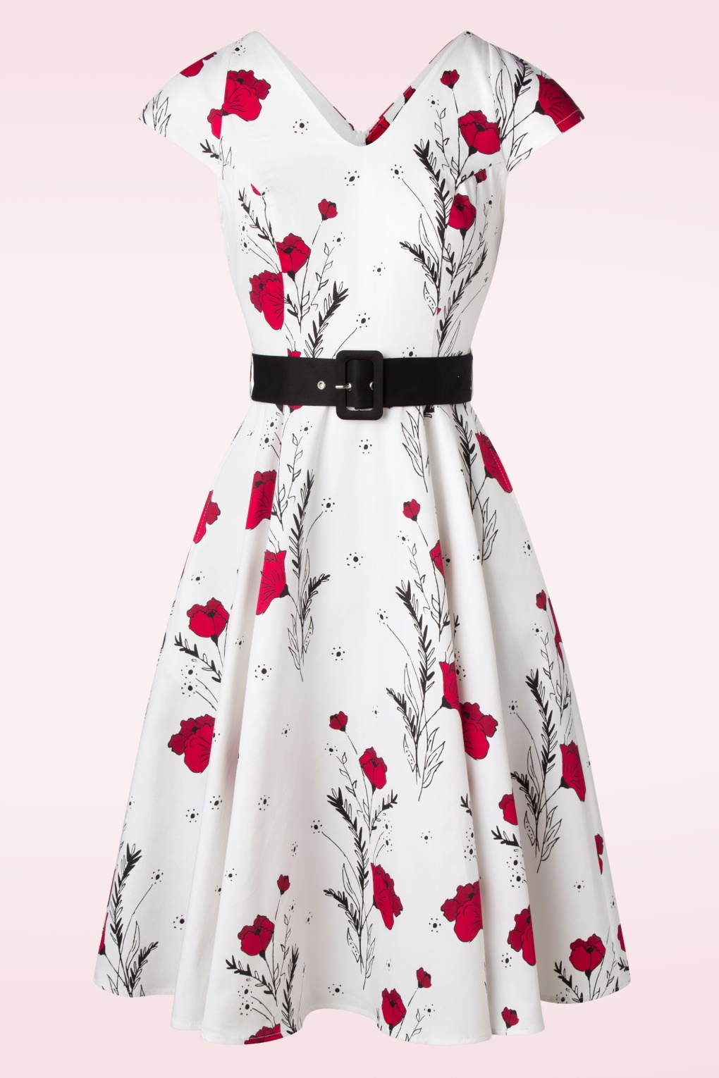 Voel je de allermooiste in deze 50s Serina Flowers Swing Dress in White! De top is voorzien van een elegante V-halslijn, V-rug en speelse kapmouwtjes. Vanaf de taille waaiert ze uit in een full swing rok die zorgt voor een super vrouwelijk silhouet. Uitgevoerd in een stevige maar luchtige, witte katoenmix met een lichte stretch en een prachtige bloemenprint in donkerrood en zwart. ”Mirror, mirror on the wall, who’s the most beautiful of them all?”   * Full swing model * V-halslijn * V-rug * Kapmouwtjes * Afneembare stoffen riem * Zijwaartse steekzakken * Combineer met een van onze petticoats voor een extra feestelijk effect * Blinde rits achterzijde * Valt bij een lengte van 1,70 m over de knie