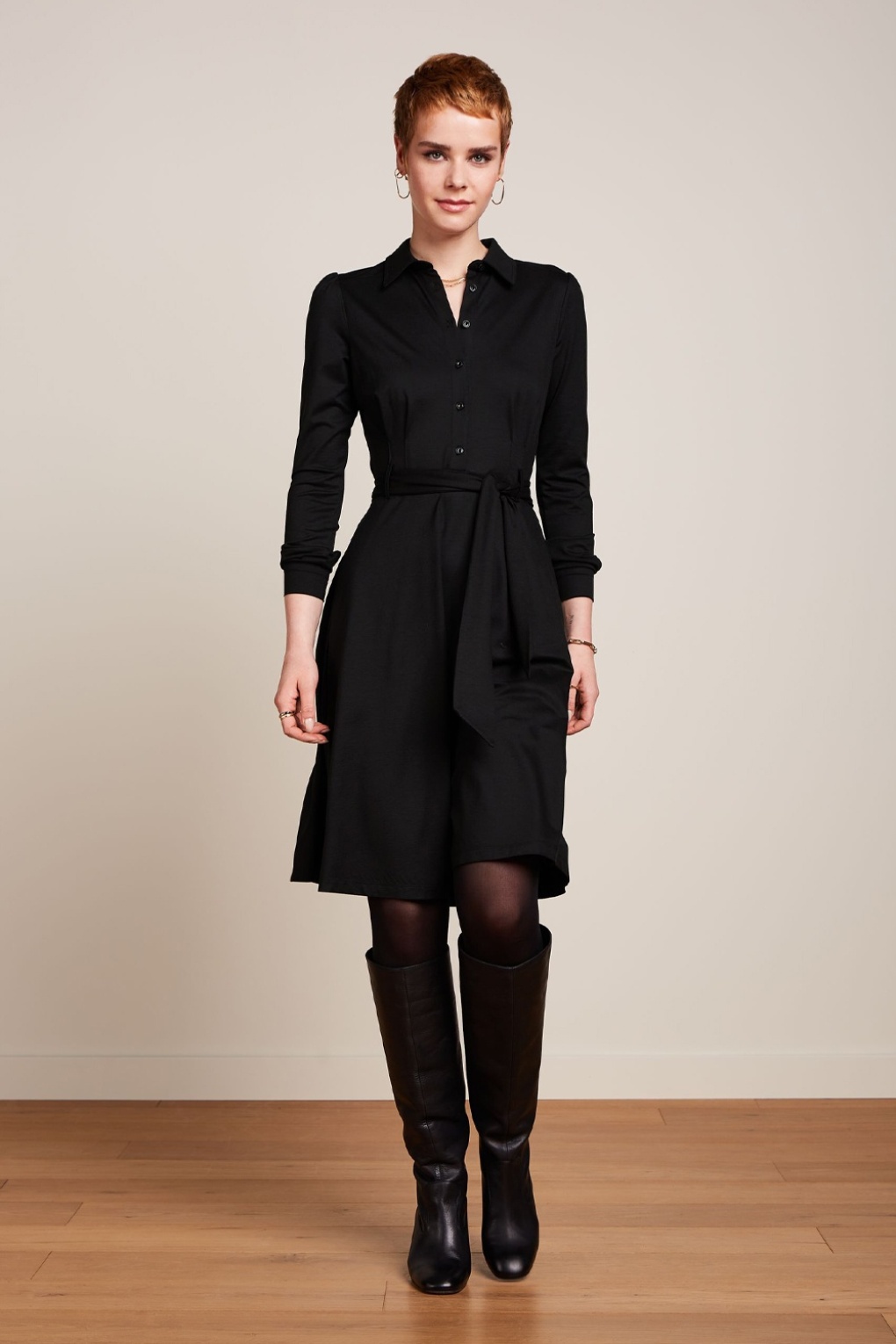 Deze Sheeva jurk is een echte retro beauty! De aansluitende top heeft een elegant kraagje, speelse knoopjes en lange mouwen. Het strikriempje zorgt voor een leuk accent in de taille vanwaar ze uitloopt in een flatterende semi-swing rok MET handige steekzakjes. De soepele en stretchy, zwarte (EcoVero) viscosemix is een genot om te dragen. “Comfy and cute, just the way we like it!”   * Knopenrij * Lange mouwen met manchetten * Afneembare strikriem voor een extra ‘snatched’ taille * It has pockets! * Valt bij een lengte van 1,70 m tot over de knie