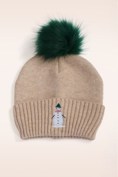 ”Stay warm and cute!” Deze muts met fluffy groene pom-pom is uitgevoerd in een zachte, fijngebreide, gemêleerde stof in beige met een sneeuwman borduursel.  * Muts met pom-pom * Zacht en warm