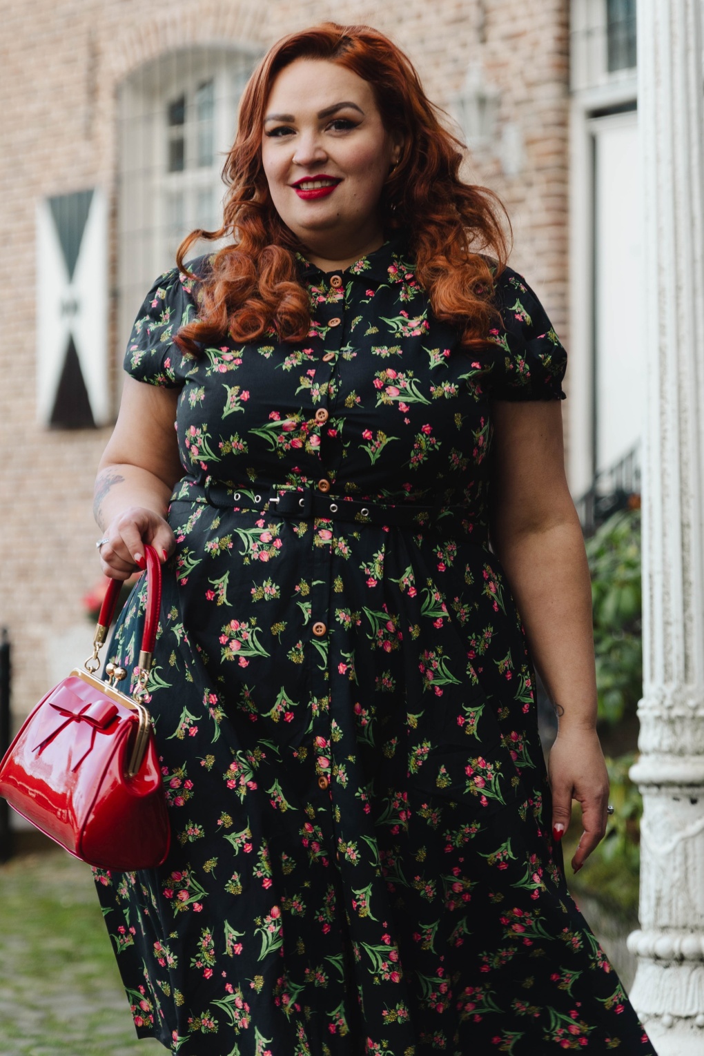 ”Bloom your own way!” Straal in deze luchtige semi-swing beauty! Ze heeft een afgeronde kraag, speelse korte pofmouwtjes met elastiek en loopt uit in een prachtige semi-swing rok, die jou een prachtig vrouwelijk silhouet geeft! Uitgevoerd in een soepele en luchtige, zwarte 100% katoen voorzien van een prachtige bloemenprint in roze, groen en geel.  * Semi-swing model * Afgeronde kraag * Korte pofmouwen met elastiek * Reeks knopen * Afneembare riem, voor een extra ‘snatched’ taille * Valt bij een lengte van 1,70 m tot halverwege de kuit