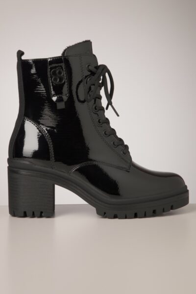 ”Walk that walk baby!” Deze veter booties zijn uitgevoerd in high quality, imitatie lakleder in zwart met een stevige blokhak en een grove trackzool.   * Lak look * Vetersluiting * Stevige blokhak * Ritssluiting zijkant * Imitatiebont voering  * Stevige (anti-slip) trackzool