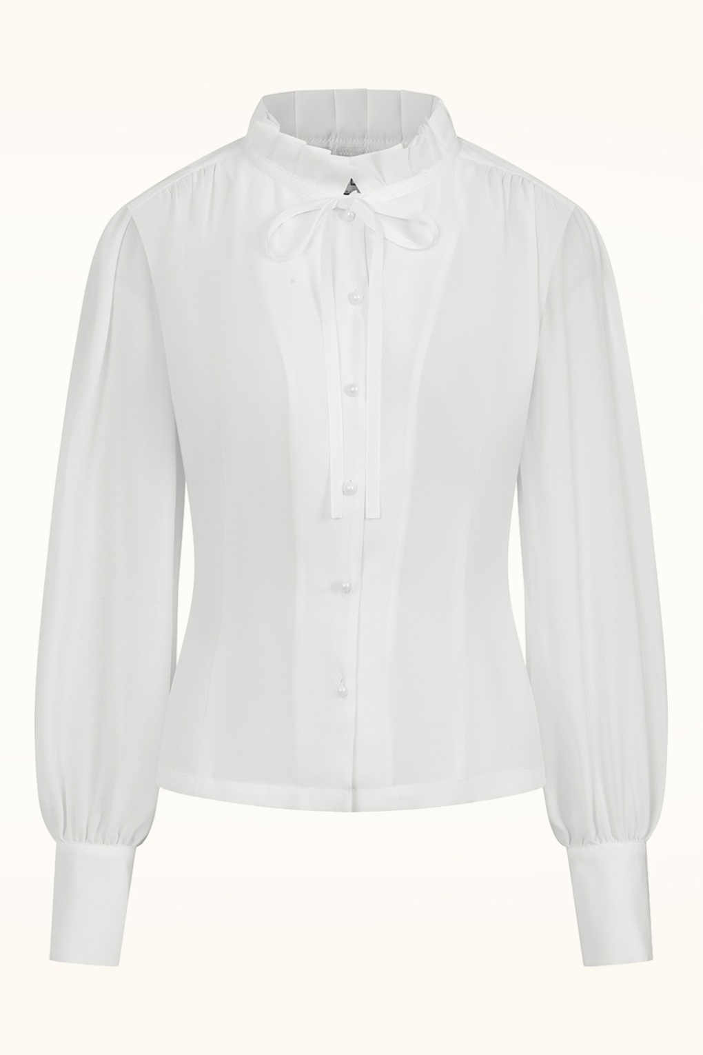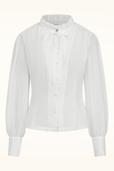 “Write your own style story.” Deze prachtige blouse is uitgevoerd in een gladde, soepele witte stof (stretcht niet) met lange pofmouwen en een kraagje voorzien van een geplooide roezel met een strikdetail. * Geplooid, opstaand kraagje * Lange pofmouwen met manchetten * Strikdetail * Knopenrij * Lang genoeg om op een normale heupbroek te dragen