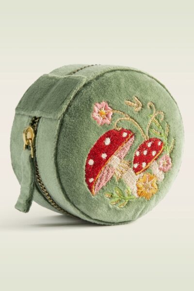 Organiseer je sieraadjes in stijl met dit mini juwelendoosje! Uitgevoerd in een zacht, groen stofje met de luxe look and feel van fluweel, voorzien van geborduurde paddenstoelen en bloemetjes met een ingewerkte glitterdraad. Dankzij de goudkleurige ritssluiting en handige binnenvakjes kan jij je favoriete ringen en oorbellen veilig opbergen ;-).   * Mini juwelendoosje * Goudkleurige ritssluiting * Handige binnenvakjes * Fluweel * Geborduurd in India
