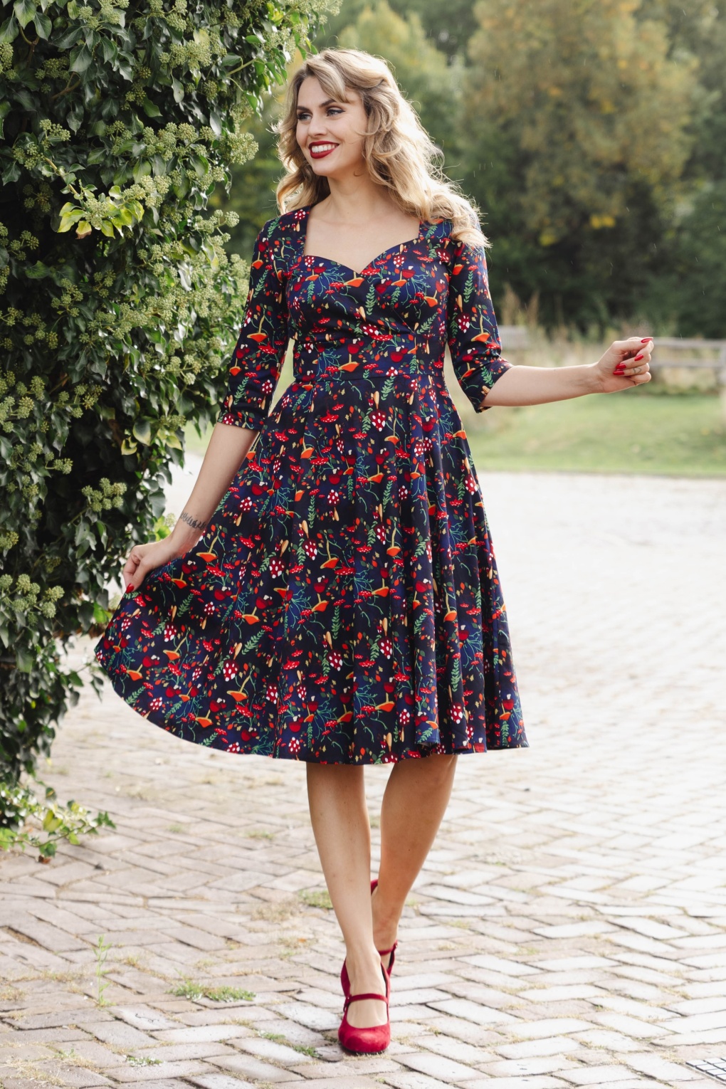 “Autumn chic, leaf it to me!” Deze beauty is exclusief bij Topvintage verkrijgbaar! Het aansluitende lijfje heeft een prachtige sweetheart halslijn met overslag, 3/4 mouwen en vanaf de taille loopt ze uit in een zwierige swing rok waardoor jij een super vrouwelijk silhouet krijgt. Uitgevoerd in een stevige maar soepel vallende donkerblauwe katoenmix, voorzien van een herfstachtige print met paddenstoelen die door onze eigen in-house designers ontworpen is.    * Full swing model * Sweethearts halslijn met vaste overslag * 3/4 mouwen * Zijwaartse steekzakken * Blinde rits achterzijde * Valt bij een lengte van 1,70 m over de knie  * De print is door onze eigen in-house designers ontworpen * Melissa is 1,78 m