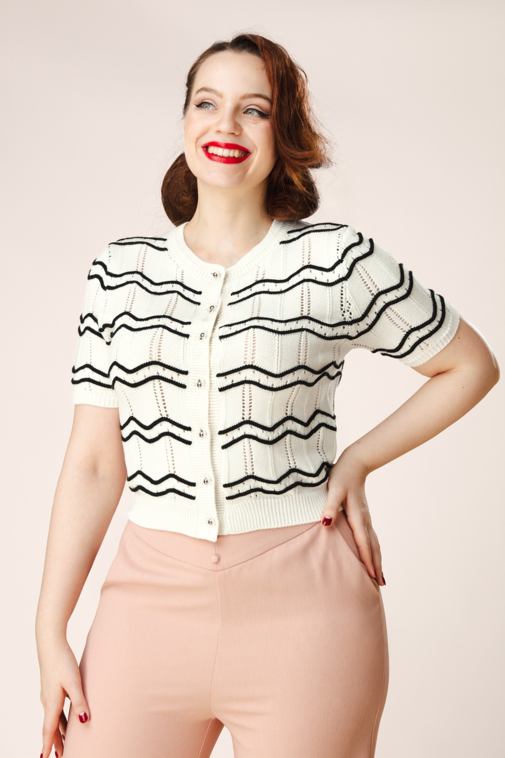 “Zig it, zag it, love it!” Dit retro cutie vestje is ontworpen door onze eigen in-house designers en is een echte knipoog naar de sixties! Ze heeft een ronde halslijn, 1/2 mouwtjes en een stijlvol zigzagpatroon in zwart op fris wit. De opvallende retro knopen geven haar net dat beetje extra charme. Ze is uitgevoerd in een zachte, fijngebreide katoenmix die heerlijk comfortabel draagt. * Ronde halslijn * 1/2 mouwtjes * Knopenreeks * Opengewerkt ajourpatroon * Stretchy ribboorden * Lang genoeg om op een normale heupbroek te dragen * Exclusief bij Topvintage verkrijgbaar