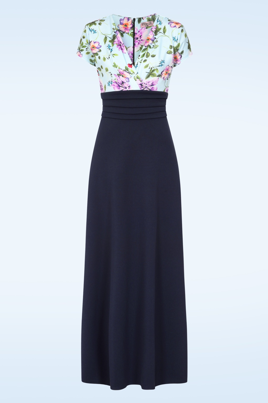 Deze Rinda floral maxi jurk heeft een echte ‘WOW’ factor! Deze pracht van een jurk heeft een aansluitende, lichtblauwe top met bloemenprint en een geplooide overslag, een flatterende geplooide tailleband en loopt vanaf de daar uit in een zwierige maxi rok in marineblauw. Ze is uitgevoerd in een soepele en stretchy, stof die heerlijk draagt. Voel je MAXImaal speciaal in Rinda!   * Maxi stijl * Gevoerde top * Vaste, geplooide overslag * Korte mouwen * Geplooide tailleband * Blinde rits achterzijde * Reikt tot aan de grond bij een lengte van 1,70 m * Exclusief bij Topvintage verkrijgbaar