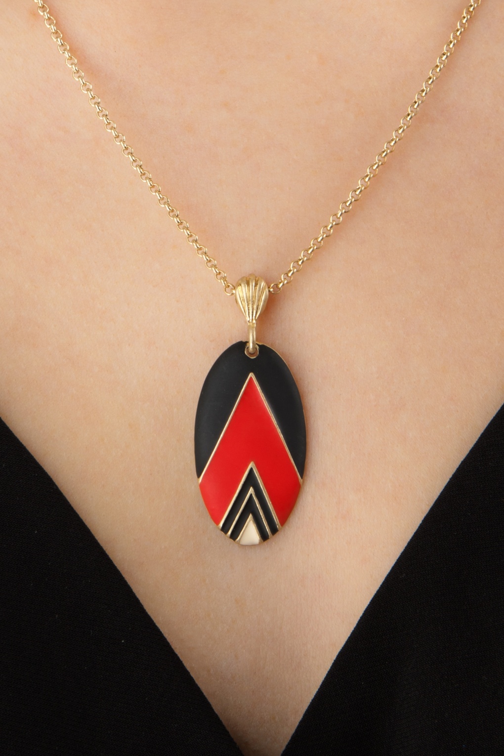 ”A work of art!” Deze ketting is uitgevoerd in goudkleurig messing met een art deco geïnspireerde hanger voorzien van mat emaille in oranjeood, zwart en crème.   * Messing (antiek goudkleurig metaal) * Handbeschilderd emaille * Verstelbare karabijnsluiting met bedeltje * Hypoallergeen * Nikkelvrij * Combineer met de bijpassende oorbellen om je look compleet te maken