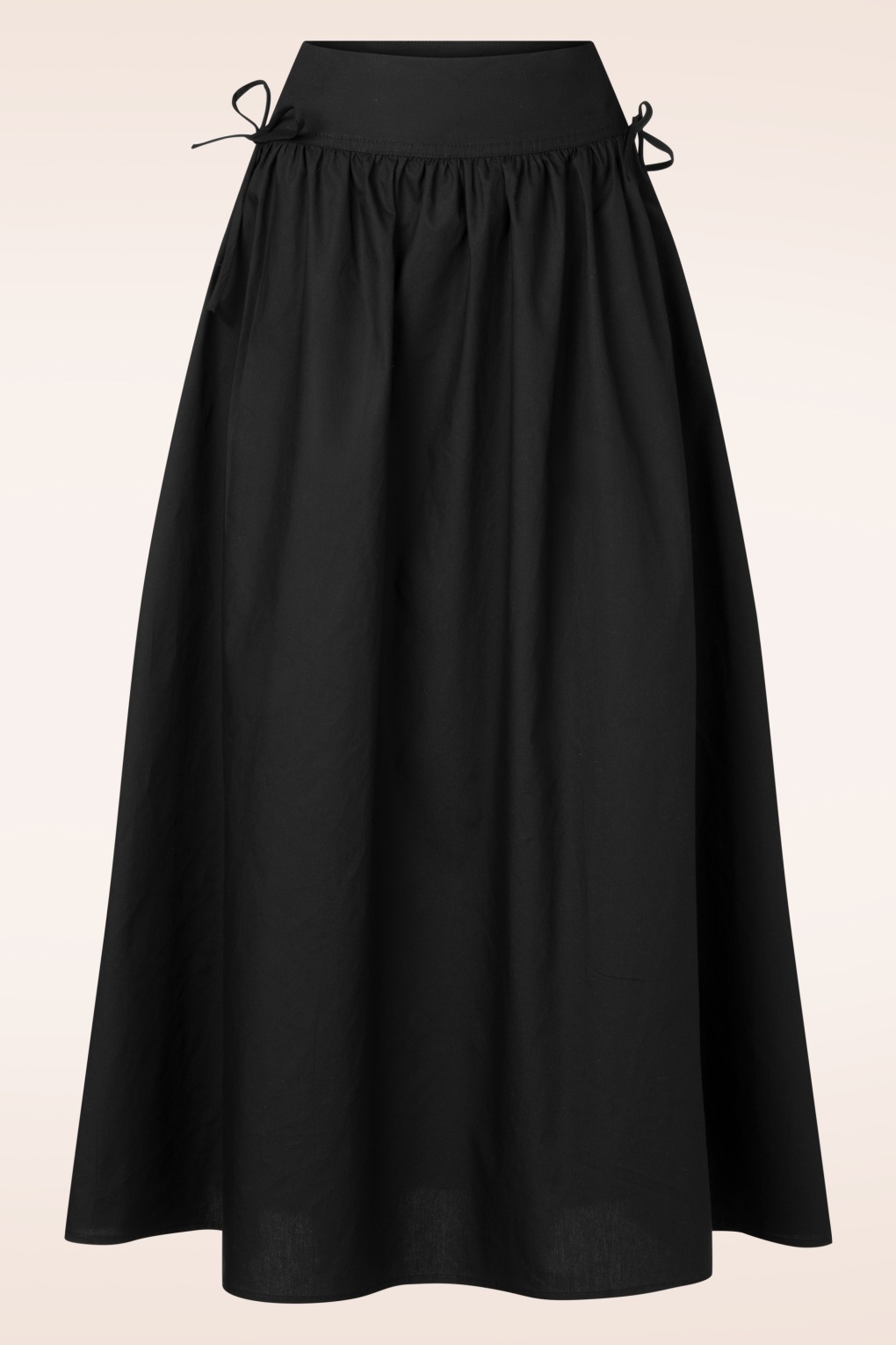 “Like a breeze on a summer night.” Willow heeft een brede tailleband met vaste strikdetails vanwaar ze uitloopt in een flowy midaxi rok. Uitgevoerd in een stevige en luchtige, zwarte katoen (stretcht niet), die heerlijk draagt en perfect is voor het komende seizoen!    * Midaxi rok * Vaste strikbandjes * Rits- en haaksluiting zijkant * Valt bij een lengte van 1,70 m tot over de kuit