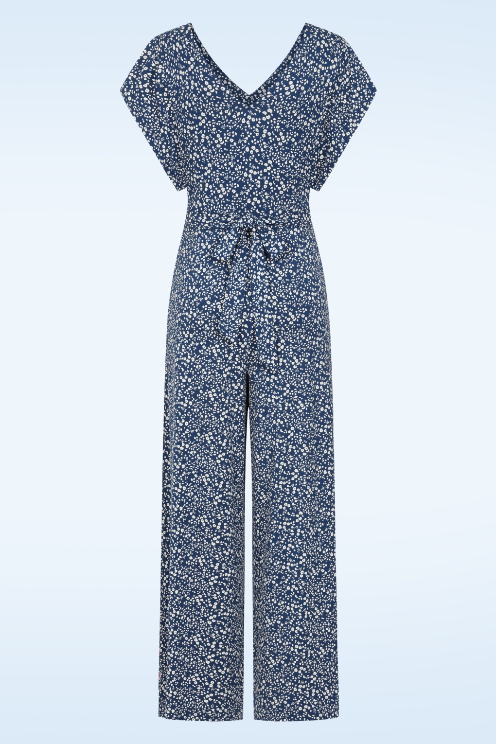“In a world full of outfits, choose the one-piece wonder!” Ze is uitgevoerd in een soepele en luchtige, stretchy, donkerblauwe EcoVero viscosemix met een witte bloemenprint.   * Jumpsuit * Korte, wijde mouwen * Vaste strikbanden * Geen ritssluiting; aantrekken en ‘ready to go’! * Wijde pijpen