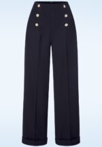 Paradeer over de promenade in stijl met deze 40s Adventures Ahead Button Trousers in Navy! Ze maakt met haar vrouwelijke hoge taille, luchtige wijdere pijp en chique omslagjes een dikke knipoog naar de jaren 40 😉 Uitgevoerd in een soepel vallende, donkerblauwe stof met een hele lichte stretch en afgewerkt met klassieke sierknopen aan de taille. Jij en deze stijlvolle broek gaan samen heel wat avonturen beleven! * Hoge taille * Sierknopen * Wijde pijpen met omslag * Steekzakjes * ‘Faux’ paspelzakjes aan de achterzijde * Blinde rits aan de achterzijde * Gorgeous brunette Yoëlle is 1,78 m