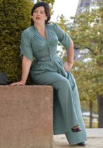 ”Time to make an unforgettable entrance!” Dit seizoen hebben onze eigen in-house ontwerpers zich laten inspireren door de iconische stijl van Ava Gardner in de film ‘Barefoot Contessa’. Celeste is uitgevoerd in een high quality, tealkleurige stof met een fijne stretch in een luxe fluwelen look die bovendien een genot is om te dragen. ”They will forever remember your name from now on, Diva!” * V-halslijn met overslag * Lange pofmouwen met manchetten * Bra strap holders zodat je bh-bandjes niet gaan schuiven * Gevoerde top * Afneembare strikband voor een extra ‘snatched’ taille * Lange wijde pijpen * Blinde rits aan de achterzijde * Stella Rose Cherry is 1,71 m: haar pumps zijn haar eigen vintage treasures * Marjolein is 1,82 m