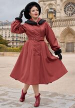 “Stay chic — rain or shine!” Blijf elegant en warm met Lena Harmony, geïnspireerd op de stijlvolle jaren ’50. Ze is uitgevoerd in een waterafstotende stof in een prachtige donker blush tint, en afgewerkt met een zwarte faux fur kraag voor die klassieke vintage touch. De double-breasted sluiting, praktische zakken en afneembare riem die je taille prachtig accentueert, maken haar zowel functioneel als flatterend. Volledig gevoerd met zacht satijn voor optimaal draagcomfort. Een tijdloze must-have die je het hele seizoen chic én droog houdt! * Swing stijl * Volledig gevoerd * Waterafstotend * Vaste capuchon * Lange mouwen * Kunstbont details * Dubbele knopenreeks * Afneembare riem, voor een extra ‘snatched’ taille * Zijwaartse steekzakken * Valt bij een lengte van 1,70 m over de knie