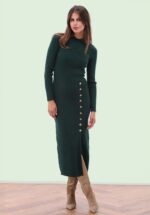 “Curve-loving knit, statement gold buttons… this maxi isn’t here to blend in.” Ze heeft lange mouwen, een hoge ronde halslijn en opvallende, goudkleurige sierknopen aan de voorzijde. Uitgevoerd in een iets stevige, ribgebreide katoenmix in dennengroen met een vleugje kasjmier. * Maxi jurk * Aansluitende fit * Lange mouwen * Split voorkant * Goudkleurige sierknopen voorkant * Geen rits of knopen; aantrekken en ready to go! * Reikt tot de enkel bij een lengte van 1,70 m