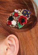 Je outfit bloeit helemaal op met deze 50s Flower Cluster Hair Clip en Broche in Multi op je favo item of in je haar! Deze broche is uitgevoerd in antiek goudkleurig metaal met kleurrijke, geëmailleerde bloemetjes en een piepklein fonkelend strass steentje. Dankzij de handige klemsluiting kun je deze broche ook als speld in je haar dragen. ”Flowers don’t tell, they show!” * Broche/haarspeld * Pinsluiting * Klemsluiting * Emaille * Strass * Nikkelvrij * Handgemaakt * Match met de bijpassende oorbellen en/of ketting voor een complete look!