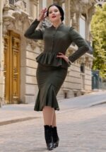 “Elegance is all in the details!” Manel Abalone is afkomstig uit de nieuwe collectie en geïnspireerd op de extraordinaire Marie-Louise Carven — een baanbrekende Franse couturière uit de jaren ’40 en ’50! Deze swing beauty straalt tijdloze charme uit met haar lange mouwen, klassieke Peter Pan-kraag en vaste stropdasdetail. De getailleerde snit zorgt voor een prachtig vrouwelijk silhouet, terwijl de soepelvallende stof haar een elegante, vintage uitstraling geeft. Ze sluit met een rits aan de achterzijde en knoopjes aan de voorzijde. * Swing model * Peter Pan kraagje * Vast stropdasdetail * Lange mouwen met manchetten * Flatterende plooitjes bij de buste * Functionele knopenreeks aan de voorzijde * Blinde rits aan de achterzijde * Afneembare riem, voor een extra ‘snatched’ taille * Voorzien van zakken! * Valt bij een lengte van 1,70 m over de knie