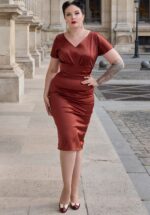 “Nostalgic charm with a touch of shine!” De Louane Sunrise jurk straalt pure 50s-elegantie uit en is afkomstig uit de nieuwe collectie, geïnspireerd op de extraordinaire Marie-Louise Carven — de baanbrekende Franse couturière uit de jaren ’40 en ’50! Ze is uitgevoerd in een stevige maar soepele katoenmix met de look & feel van luxe satijn in een warme Sienna tint die prachtig met het licht speelt. De flatterende V-halslijn, geplooide taille en elegante kick pleat aan de achterzijde zorgen voor een vrouwelijk silhouet met tijdloze allure. Dankzij de ritssluiting aan de achterkant sluit ze mooi aan en accentueert ze je figuur op de juiste manier. * Pencil model * Korte mouwtjes * V-halslijn en V-rug * Geplooide tailleband * Blinde rits achterzijde * Kick pleat aan de achterzijde * Valt bij een lengte van 1,70 m over de knie