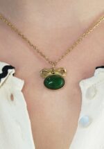 Cute and timeless! Deze ketting is uitgevoerd in verguld stainless steel met een hangertje dat voorzien is van een donkergroene, vintage glazen steen en een strik ‘on top’. * Korte, verstelbare ketting * Glas steentje * Karabijn sluiting * Verguld stainless steel * Nikkelvrij (anti-allergeen) * Wordt geleverd in een leuk doosje