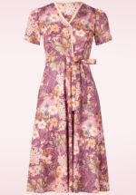 “Bloom boldly; where classic charm meets vibrant colour.” Ze heeft een V-halslijn met een crèmekleurig broderie ric-rac biesje, korte mouwen en een reeks knopen op het lijfje. Het striklint accentueert je taille voor een super vrouwelijk silhouet vanwaar ze overloopt in een flowy midi rok. Uitgevoerd in een soepele, luchtige 100% katoen (stretcht niet!) met een bloemenprint in roze, paars en oranjetinten. * Semi-swing midi jurk * V-halslijn met broderie ric-rac biesje * Korte mouwtjes * Reeks knopen voorzijde * Afneembaar striklint * Zijwaartse steekzakken * Blinde rits aan de zijkant * Valt bij een lengte van 1,70 m halverwege de kuit