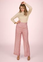 Geïnspireerd op de pantalons die de vooruitstrevende dames in de jaren 40-50 droegen! De vrouwelijke hoge taille vormt een mooi contrast met de wijde pijp en heeft een super afkledend effect, ook als je vollere heupen/billen hebt. Het strikje en knoopdetail aan de achterzijde maken het geheel helemaal af. Uitgevoerd in een soepel vallend, licht stretchy stofje in teal/groen en afgewerkt met een chique omslagje bij de pijpen. Combineer met een witte blouse en pumps voor de perfecte zakelijke look in retro stijl! * Wijde pijpen * Afneembaar strikje voorzijde * Zijwaartse steekzakjes * Blinde rits zijkant * Gemakkelijk in te korten * Vanessa Frankenstein is 1,67 m * De afgebeelde blouse is niet meer verkrijgbaar in onze shop * De afgebeelde pumps zijn niet verkrijgbaar in onze shop