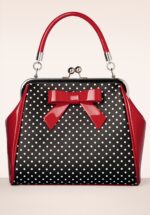 Ook Banned heeft dit seizoen weer je ‘bag’ met deze 50s Frances Polka Star Bag in Black and Red! Deze beauty heeft een opvallende zilverkleurige metalen knipsluiting en is uitgevoerd in een combinatie van lipstickrood ‘faux’ lakleder en zwart ‘faux’ leder afgewerkt met een schattige strik en een print van witte polkadots. Ze wordt bovendien geleverd met een langer, verstelbaar hengsel zodat je haar ook speels om je schouder kunt dragen. En al je essentials passen er met gemak in, dus volg je (vintage) modehartje en bestel haar nu! * Medium sized * Knipsluiting * Binnenvak met 3 extra vakjes, waarvan 1 met rits * Afneembaar hengsel * Kan crossbody gedragen worden * Volledig gevoerd * Groot genoeg voor je telefoon, sleutels, en portemonnee