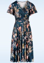 Irene overslag swing jurk met bloemenprint in petrol blauw